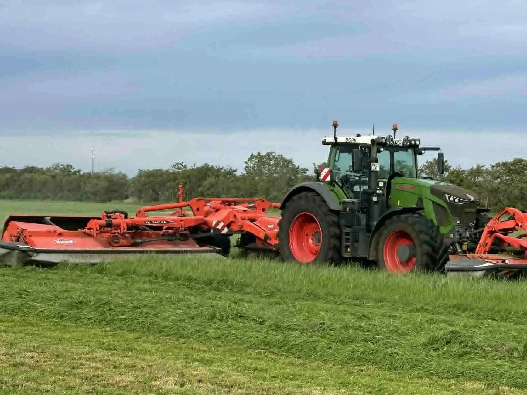 Skårlægning af græs med 12 m Kuhn 13460 med bredspredning eller skårsamler. Traktoren er udstyret med autostyring for optimal udnyttelse af skårlæggeren hele tiden.